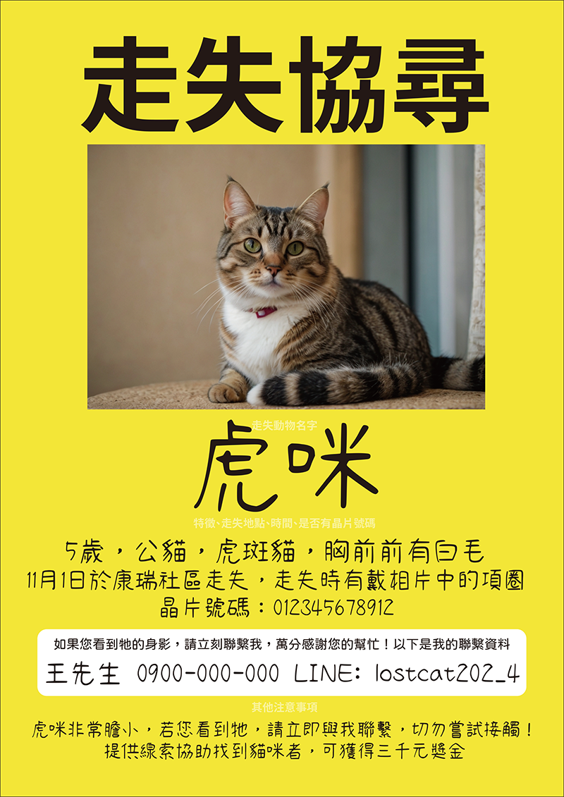 - 張貼方式:為確保傳單能長時間保存並被清楚辨識,可將傳單塑封或使用防水膠帶固定。持續補充和更新傳單,直到找到寵物為止。