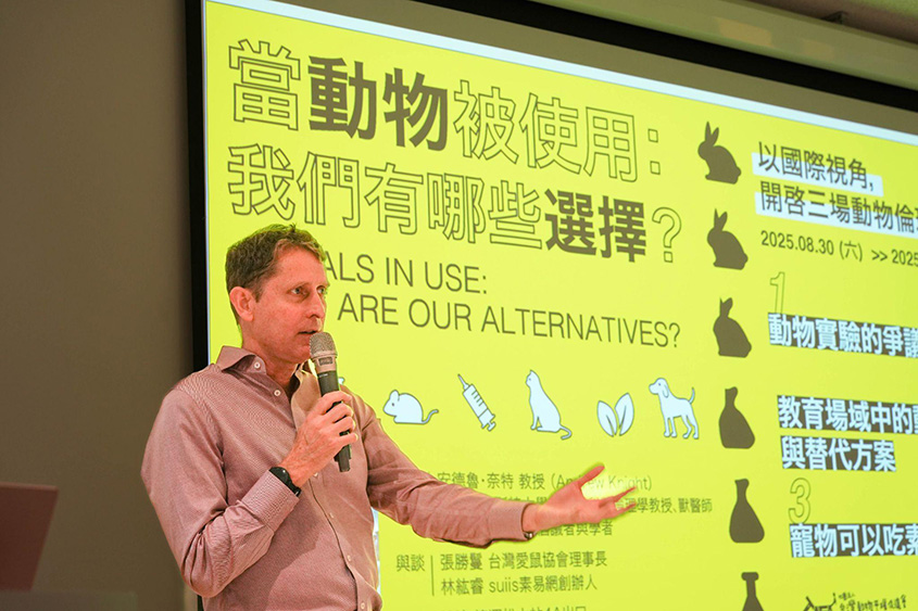 主講人安德魯・奈特(Andrew Knight)教授的講題為「教育中的動物使用與替代方法」(Educational Animal Use and Alternatives),介紹在獸醫與生物醫學教育領域的動物使用、制度改革與人道倡議,提供多篇論文及案例分析,而他本人為動物倡議的故事更是典範。