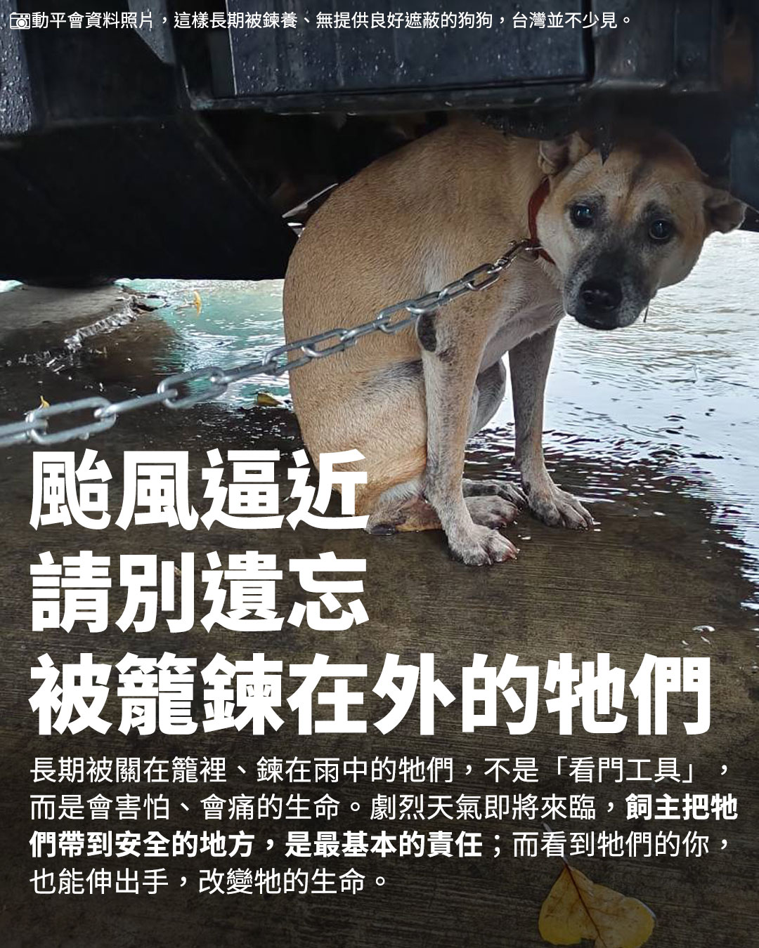 對人來說,家是風雨中的避風港;但對這些被長期不當籠、鍊飼養在外的狗狗而言,像颱風這類極端天氣往往是牠們最接近死亡的時刻。