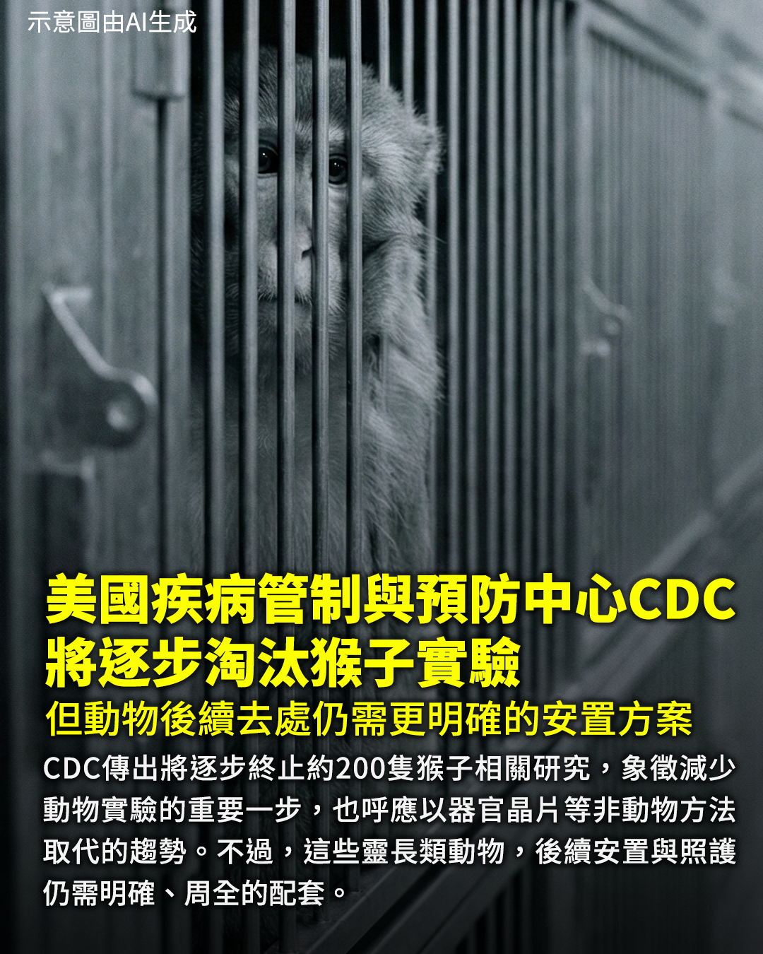 美國疾病管制與預防中心(CDC)將終止所有猴子研究消息人士稱,愛滋病毒(HIV)及其他傳染病的相關研究將會逐步淘汰;該機構動物的命運仍不明朗